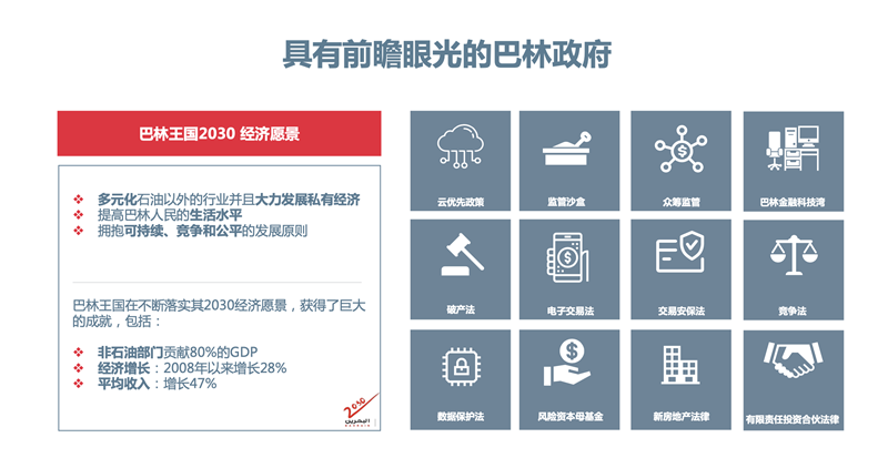 巴林王国是过去40年的中东金融中心,在经济上,最早摆脱了对能源行业的依赖,进行多元化改革。目前金融业、运输物流、高端制造业等成为巴林经济支柱。文化上,巴林王国以开放包容著称,在保留伊斯兰教和阿拉伯传统之外,还非常包容外国文化、宗教、习俗,巴林王国已经连续多年排名中东北非地区外国人宜居国家榜首。